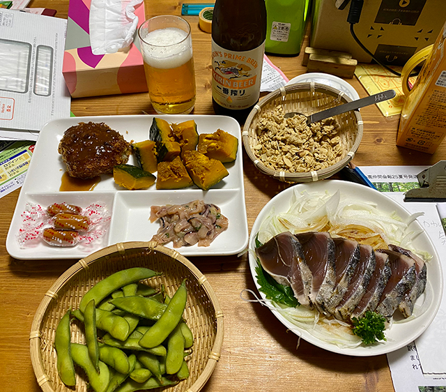 使い古した言葉ですがこのところ金欠が甚だしくて爪を灯す様な食事状が続いてましたが数十日ぶりに入金があって不払いでガスはもう1週間止まったままで電気の停止が30日に迫ってましたが多々有る債務としたらスズメの涙程度の入金!一日一回の食事で耐えて来ましたがついに現金を見たので仕事帰りにスーパーに立ち寄って底をついた調味料と惣菜など十八品目を調達!しばしの食糧事情が改善されましたが涼しくなって食欲が湧いて来たところで耐えてましたので▷いくら健康維持のためと言え一日一食では空腹感を我慢するのも苦労しましたがその反動で店で見るものに食欲が湧いて今夕のツマミは近頃になくこんな具合で自分的には超がつくほど豪華⁈普段から少食を心がけているのでこれだけでも一時間以上時間を掛けての夕食!理想は繰り返しになりますが一日一食でも充分な活動ができて空腹を感じる事は大切な健康維持なのだそうですが仕事中でも何か食べたい!との欲求はストレスになっていたのです!これで少しでも体重が元に戻ってくれれば改めての少食主義をやってもいいのですがそれよりも酒ビールを毎日ではなくて肝休日などと言わずとも毎日の習慣にせずに涼しくなってきたからこそチャンスと思ってビールを止めた方が良いのかもしれませんね!まあこんなにくどクドと健康を考える人ほど病に成りやすいとも聞いてますので▶︎これも波動の問題で細かなことを考えずに基本の食事さえしていればモット天真爛漫に生きた方が得策かもしれません!