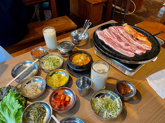 この歳になっても田舎者にとっては産まれて初!と云う体験が先ごろの東京タワーではありませんが今年も続きましたが今日は昨日記した生保レディー?との新宿大久保での本格朝鮮料理を頂く会食に誘われましたが噂には聞いてましたが山手線新大久保駅を前後してその通り周辺はチャイナもありましたが殆どが韓国関連の飲食街←この近くには昔お付き合いがあった建具屋さんがテナントビルのオーナーで暮らしていて何度も尋ねた覚えのある土地でしたがあまりにもの変貌にびっくり!まるで本国に来た様な街区には日本人が目立ちはしましたが外国人ばかりが通行して休日とあって歩道を埋め尽くしてましたが案内されたのはこんな石焼スタイルの豚焼き肉を中心とした純韓国料理!とりあえずビール!と思いましたが韓国の酒ときたらマッコリ!度数が高そうだったので聞いたら6度程度との事でビールとほぼ同じで見掛けは最近ハマって日頃呑んでる日本酒の濁り酒と同じな米麹の乳白色!マッコリ自体はお初ではありませんでしたがモウ何十年ぶりかのタブン二度目の酒!濁り酒より▷ソフトな甘さが▷度数が低くてストレートで飲めるのでたしなむ程度に呑めば体にも良さそう!キムチに代表される様に料理はすべて辛い!とのイメージがありましたが肉と一緒に焼かれた白菜のキムチは辛さの裏に甘味も感じて刺激強いモノはあまり口にしない自分でも適度な濃厚さも味わえたのです!ただ焼き物は店員さんが焼きとカットまでやってくれますがこんなに綺麗な肉が▶︎焦げるほど▶︎硬くなる程に充分過ぎる?加熱をするので自分的味わいはイマイチでしたが野菜類が多種豊富にあったので小ジョッキ一杯だけでしたがマッコリを頂きながらのまるで韓国に来た雰囲気の中での会食は正に非日常を十二分に堪能できたのです!